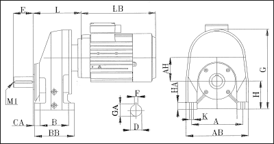 - вариант исполнения на лапах, ось горизонтальная, лапы налево - вид от двигателя (B6);